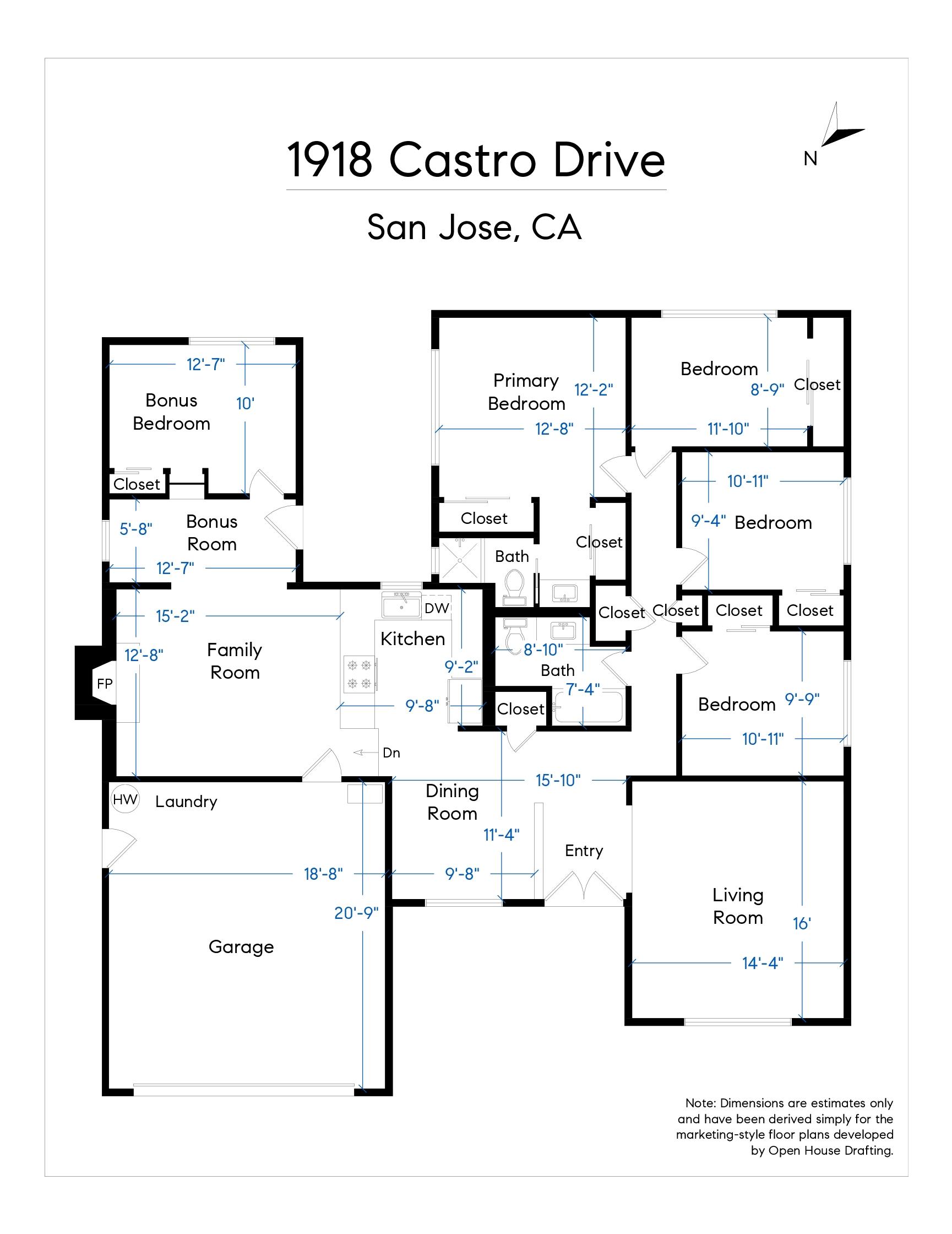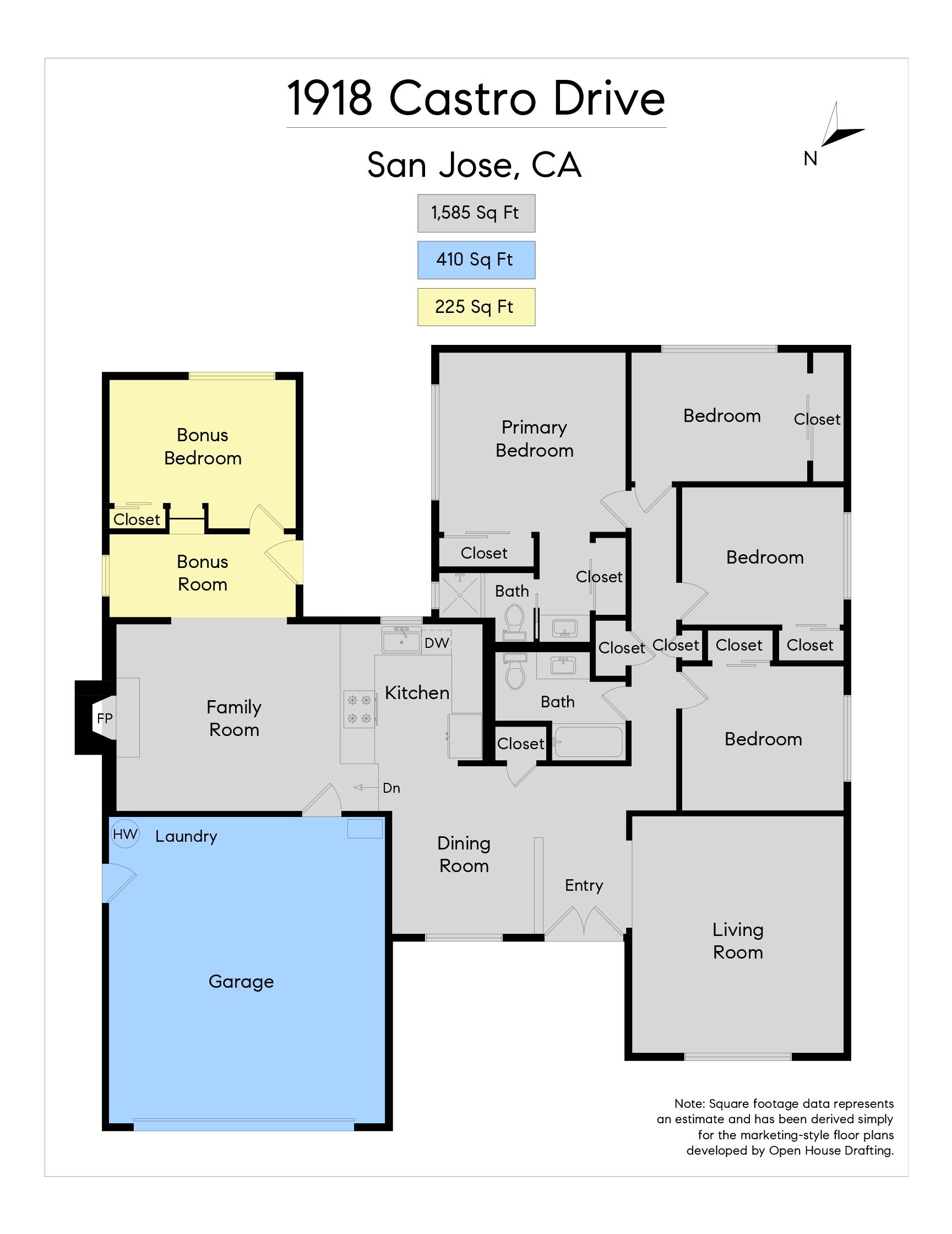- Approximately 1,585 square feet of living space, plus a bonus bedroom and bonus space of 225 square feet and a 2-car garage of approximately 410 square feet